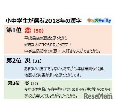 小中学生が選ぶ2018年の漢字は、1位「恋」、2位「災」、3位「楽」となったことがニフティが運営する子ども向けWebサイト「キッズ@nifty」が実施したアンケートより明らかになった。「恋」は2年連続で1位に選ばれている。