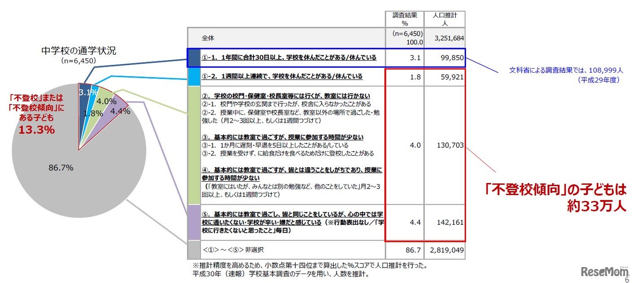 年間欠席数が30日未満の不登校傾向にある中学生が、全国で33万人と推計されることが2018年12月12日、日本財団の調査結果からわかった。中学校に行きたくない理由は、身体的症状のほか、「授業がよくわからない」「テストを受けたくない」など学業的な要因も多かった。