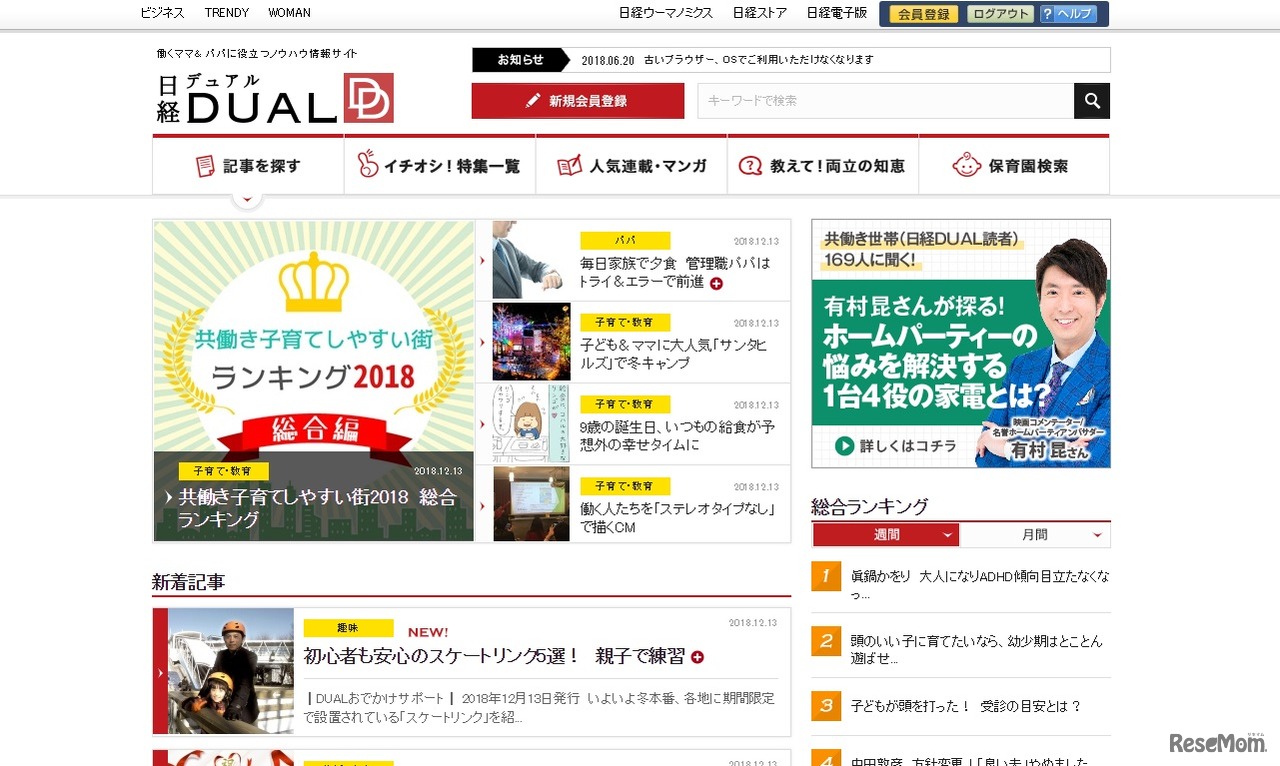 日経DUALと日本経済新聞社は、自治体の子育て支援に関する調査を共同で実施し、「共働き子育てしやすい街ランキング2018」を発表した。総合1位は「宇都宮市」と「新宿区」の2自治体が受賞した。
