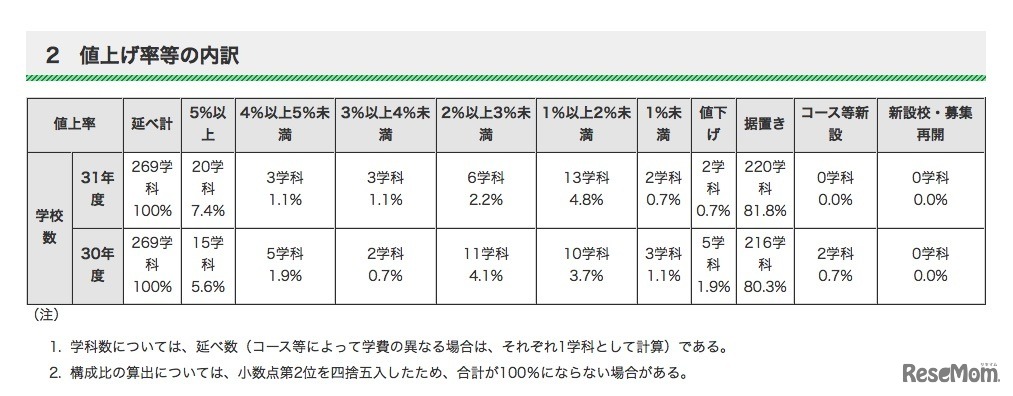 画像出典:東京都「平成31年度 都内私立高等学校(全日制)の学費の状況」 値上げ率等の内訳