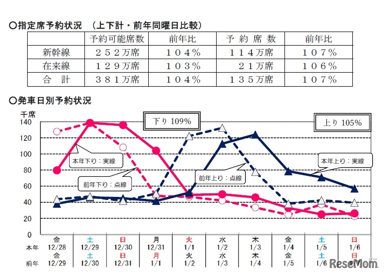 JR6社は2018年12月13日、年末年始の指定席予約状況を発表した。2018年12月28日から2019年1月6日に予約されている新幹線の指定席は、各社とも前年より増加。東海道新幹線は前年より13%増えている。