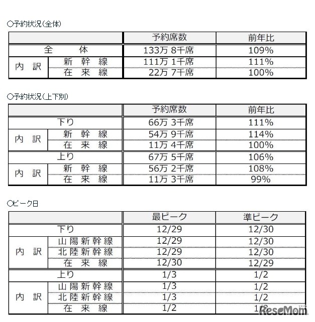JR6社は2018年12月13日、年末年始の指定席予約状況を発表した。2018年12月28日から2019年1月6日に予約されている新幹線の指定席は、各社とも前年より増加。東海道新幹線は前年より13%増えている。