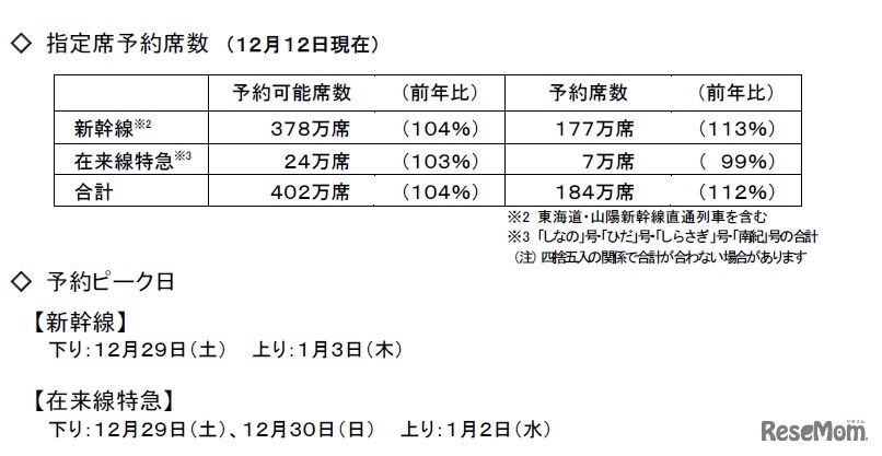 JR6社は2018年12月13日、年末年始の指定席予約状況を発表した。2018年12月28日から2019年1月6日に予約されている新幹線の指定席は、各社とも前年より増加。東海道新幹線は前年より13%増えている。