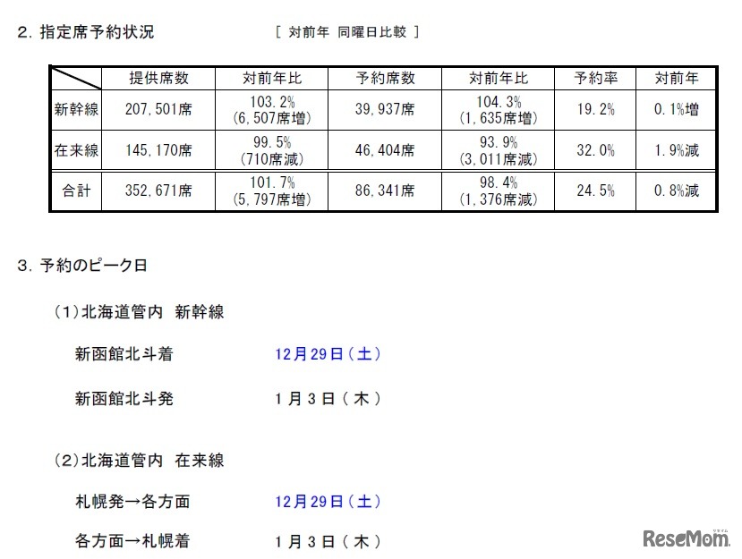 JR北海道、年末年始の指定席予約状況(2018年12月13日発表)