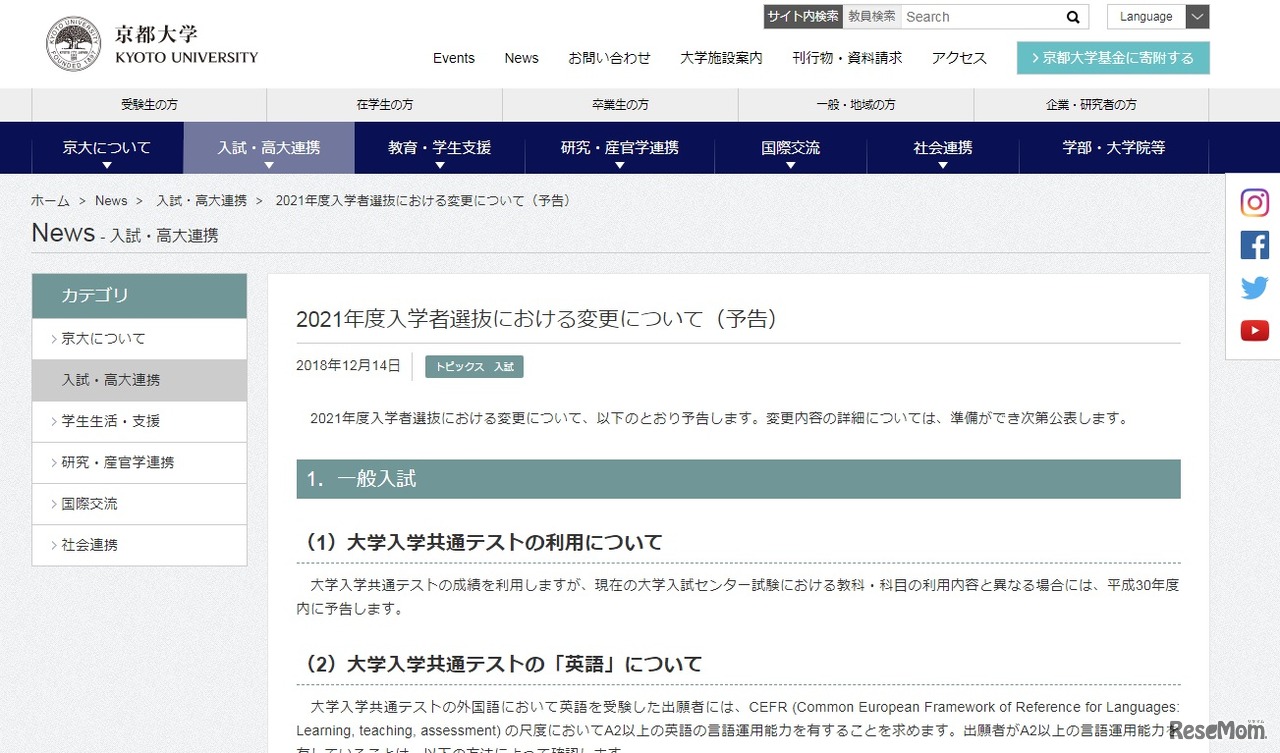 京都大学は2018年12月14日、2021年度入学者選抜における変更について発表した。出願資格は「CEFR対照表のA2レベル以上」に相当する英語力とし、英語民間試験の成績または英語民間試験の成績または同等の英語力があると明記された書類の提出を求める。