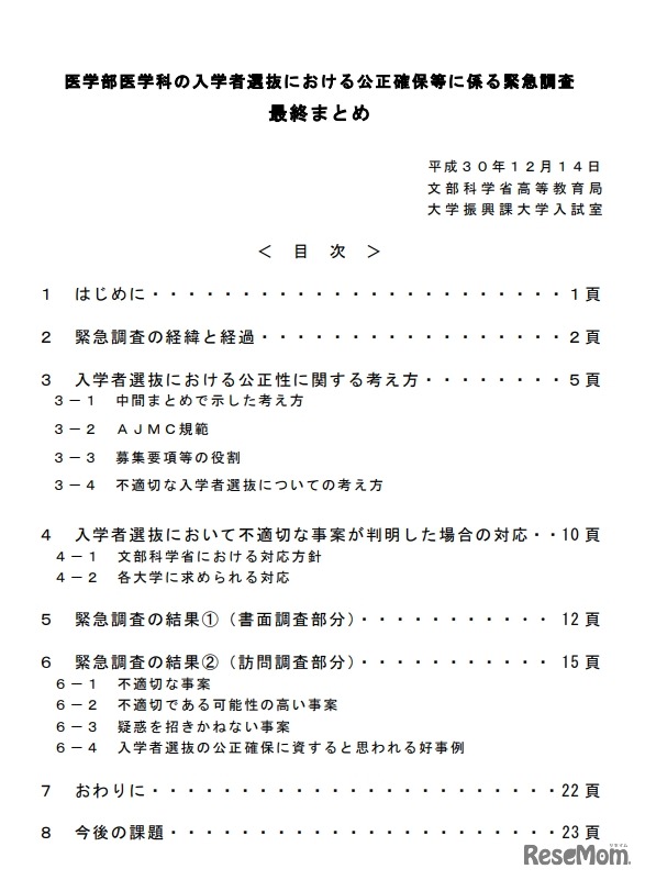 文部科学省は2018年12月14日、医学部医学科の入学者選抜における公正確保等に係る緊急調査の最終まとめを公表した。81大学のうち、昭和大学や聖マリアンナ医科大学など10大学の医学部医学科入試について「不適切」と指摘した。