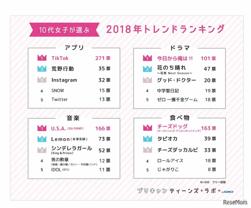 GMOメディアの運営する10代の女の子に関する研究機関「プリキャンティーンズラボ」は2018年12月6日、「10代女子の2018年流行総まとめ」を発表した。