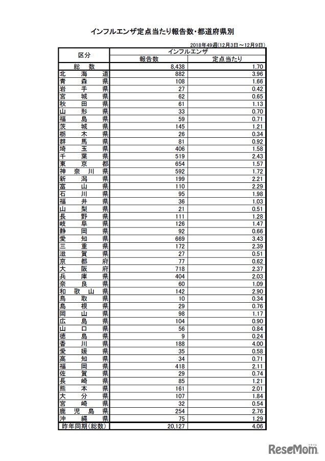 厚生労働省は2018年12月14日、第49週(12月3日から12月9日まで)のインフルエンザ発生状況を発表した。定点あたり患者報告数が1.70人となり流行開始の目安である1.0人を上回ったことから、流行シーズンに入ったと発表した。
