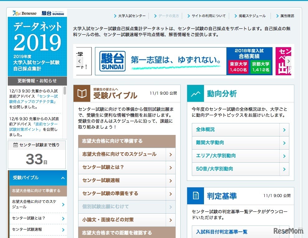 駿台は2018年12月14日、「2019年度大学入試センター試験自己採点集計 データネット」の案内を掲載した。12月下旬より配布される「集計カード」は、2019年1月21日午後5時までに最寄りの駿台校舎窓口に提出する。