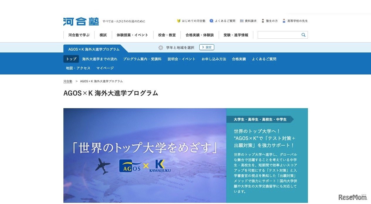 河合塾の海外大進学を目指すコース「AGOS×K(アゴス・ケイ)」は、2018年12月26日と2019年1月5日の2日間、米国トップ・人気・難関私大在校生による「海外大進学対策・留学体験談セミナー」を開催する。参加は無料。Webサイトまたは電話で申込みを受け付けている。