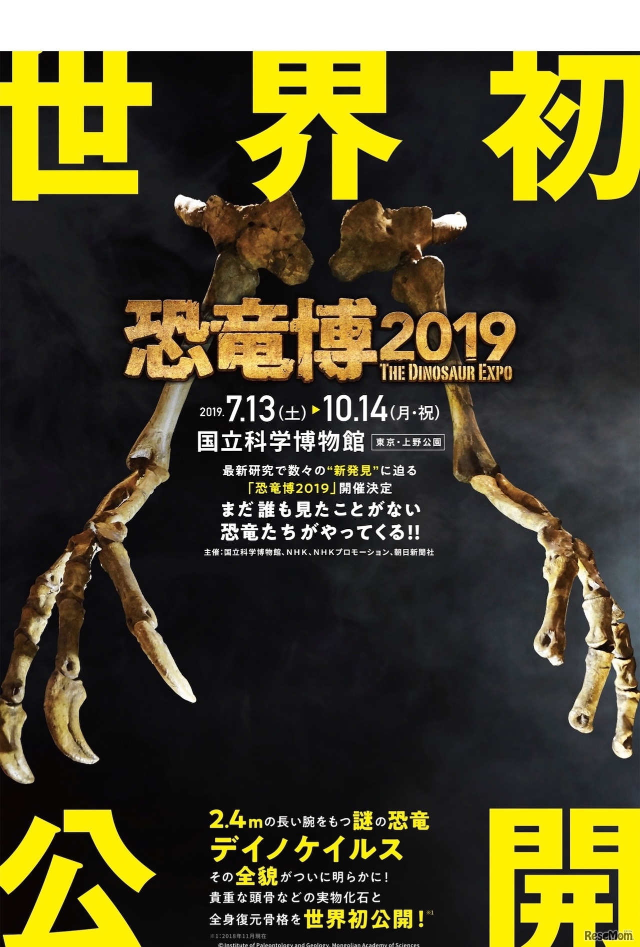 2019年7月13日から10月14日の期間、国立科学博物館において特別展「恐竜博2019」の開催が決定した。謎の恐竜「デイノケイルス」の全身復元骨格や、日本最大の発見といわれる「むかわ竜」の全身骨格化石が世界初公開される。