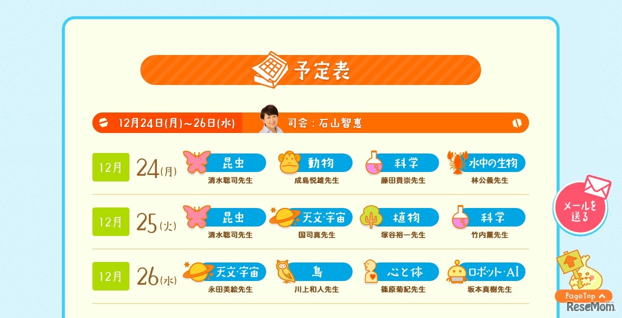 2018年冬休みにNHKラジオ第1放送の番組「冬休み子ども科学電話相談」が放送される。放送日は、2018年12月24日~12月28日と2019年1月2日~1月4日。そのほか12月29日のラジオ特番にも参加する。子どもたちからの質問は放送当日の電話のほか、メールでも随時受け付けている。