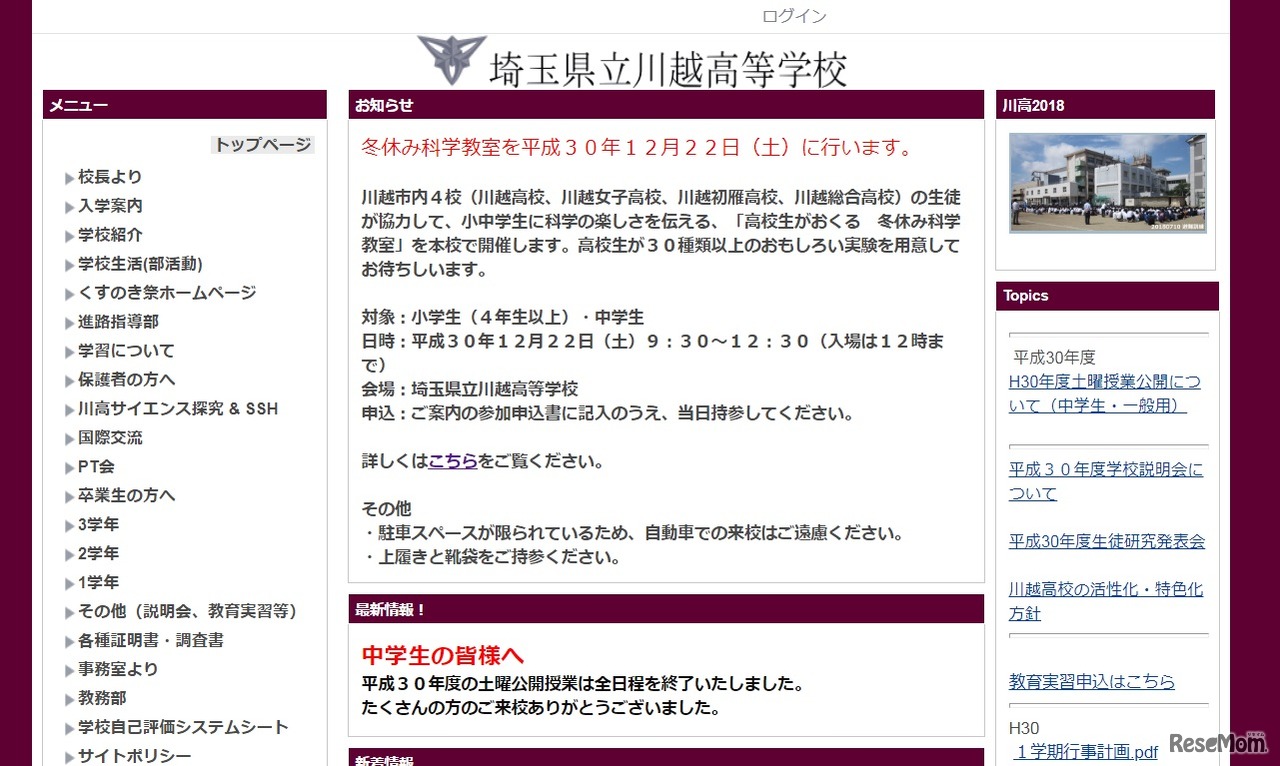 川越高校・川越女子高校・川越初雁高校・川越総合高校は2018年12月22日、小学4年生から中学3年生を対象に「高校生がおくる 冬休み科学教室」を開催する。高校生が講師となり、30種類以上の実験を実施する。