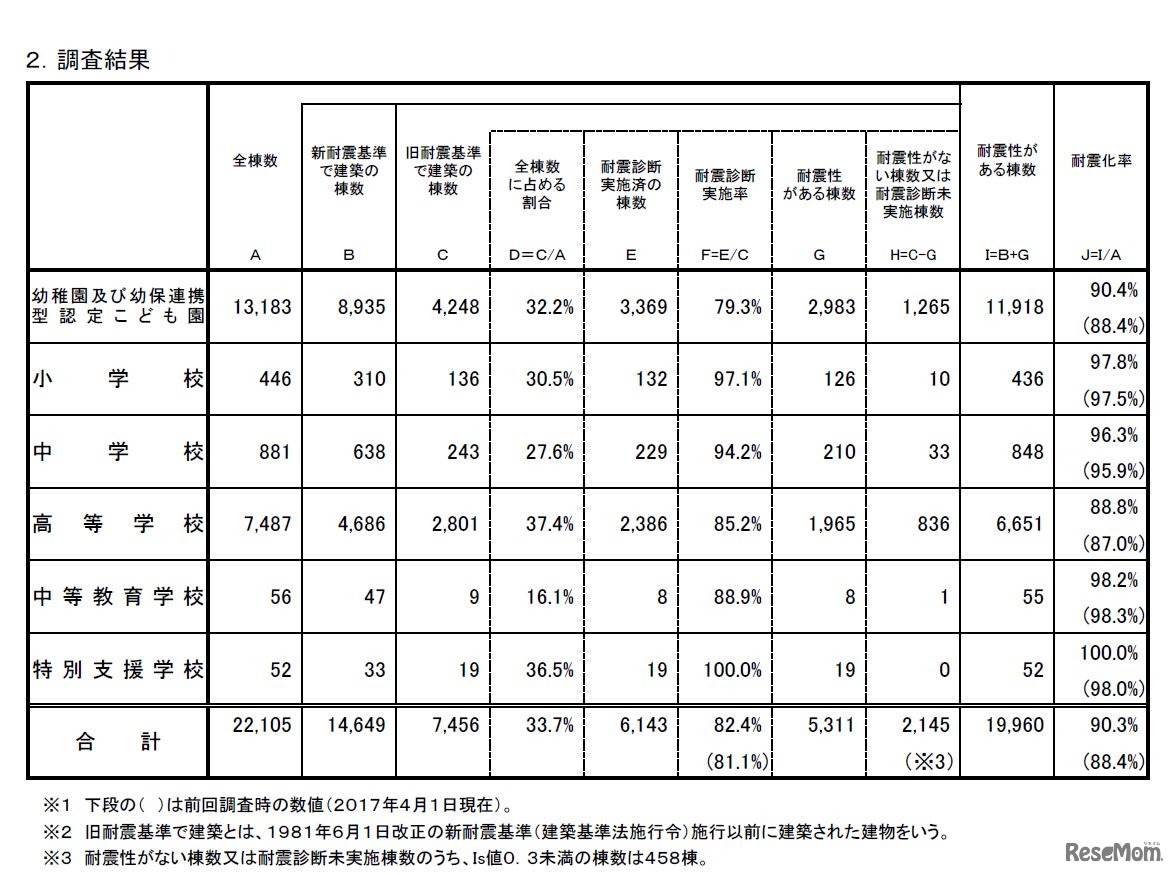 文部科学省は平成30年12月17日、私立学校施設の耐震改修状況調査の結果を公表した。私立の幼稚園や小中高校などの耐震化率は前年度比1.9ポイント増の90.3%、私立大学などの耐震化率は前年度比1.3ポイント増の91.6%であった。