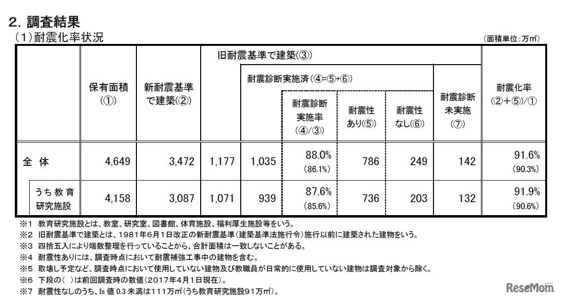 文部科学省は平成30年12月17日、私立学校施設の耐震改修状況調査の結果を公表した。私立の幼稚園や小中高校などの耐震化率は前年度比1.9ポイント増の90.3%、私立大学などの耐震化率は前年度比1.3ポイント増の91.6%であった。