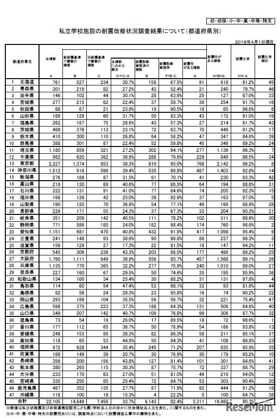 文部科学省は平成30年12月17日、私立学校施設の耐震改修状況調査の結果を公表した。私立の幼稚園や小中高校などの耐震化率は前年度比1.9ポイント増の90.3%、私立大学などの耐震化率は前年度比1.3ポイント増の91.6%であった。