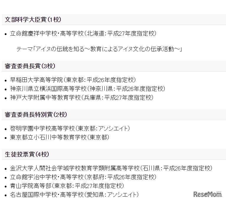 文部科学省は2018年12月17日、スーパーグローバルハイスクール(SGH)全国高校生フォーラムで10校に表彰を行ったと発表した。もっとも優秀な発表を行った立命館慶祥中学校・高等学校に文部科学大臣賞を授与した。