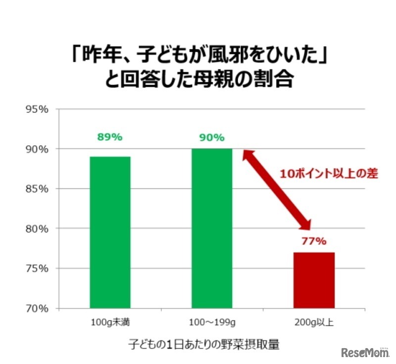 普段から十分な量の野菜を摂取している子どもと、摂取していない子どもでは、風邪の罹患率に違いがあることが、トレンド総研のアンケート調査により明らかになった。小児科医も、「野菜摂取は『免疫力アップ』に有効」だとコメントしている。