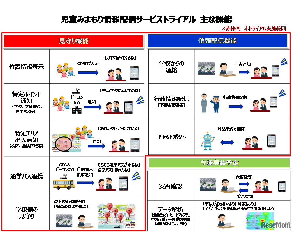 児童みまもり情報配信サービストライアルのおもな機能
