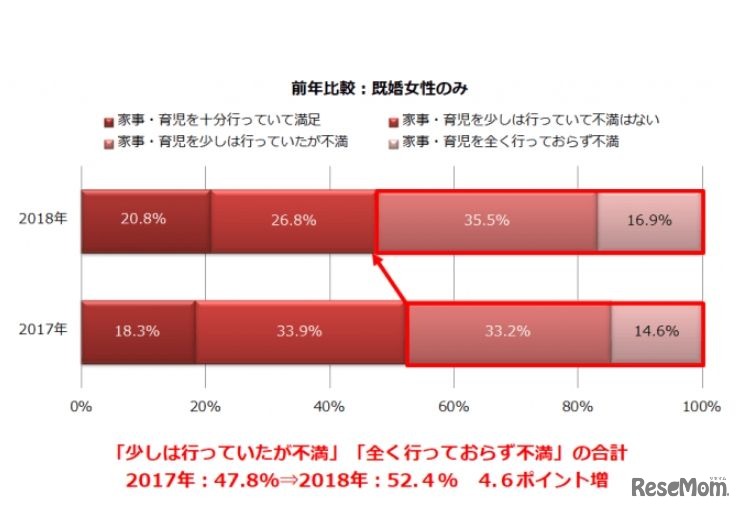しゅふJOB総研は2018年12月18日、仕事を持つ既婚女性対象の「夫の家事・育児」をテーマとしたアンケート調査結果において、夫の家事・育児に「不満」を持つ割合が52.4%だったと発表した。2017年の調査と比較して不満足度は4.6ポイント上昇した。