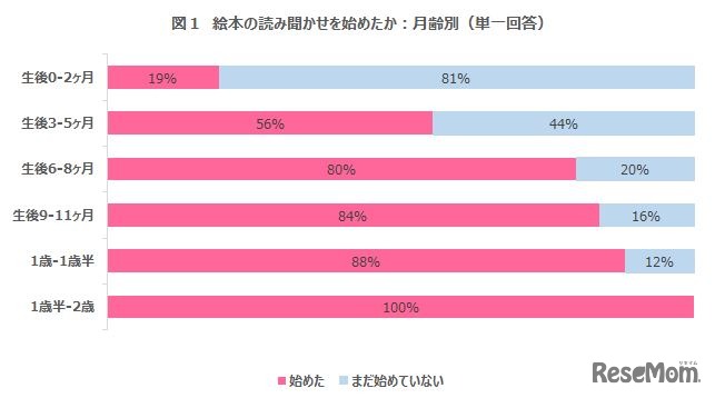 コズレ子育てマーケティング研究所は2018年12月19日、「絵本の読み聞かせに関する調査」の結果を公表した。読み聞かせを始めた月齢は「生後3~5か月」が半数以上を占め、読み聞かせをするタイミングは「昼」と「就寝前」が多かった。