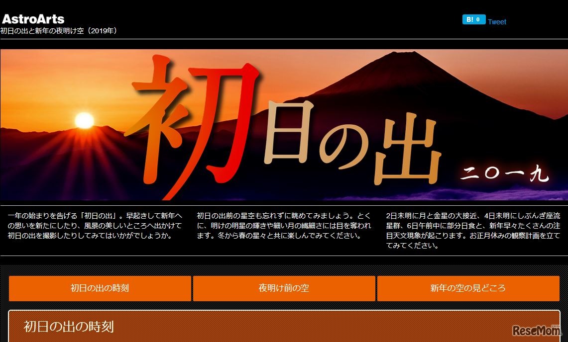 年末年始を前に国立天文台やアストロアーツなどは、2019年の「初日の出」の情報をWebサイトに掲載している。お勧めスポットや晴れ出現率などを紹介するサービスもあり、新年の始まりを告げる「初日の出」を眺めたり、撮影したりするため、事前準備に役立ちそうだ。