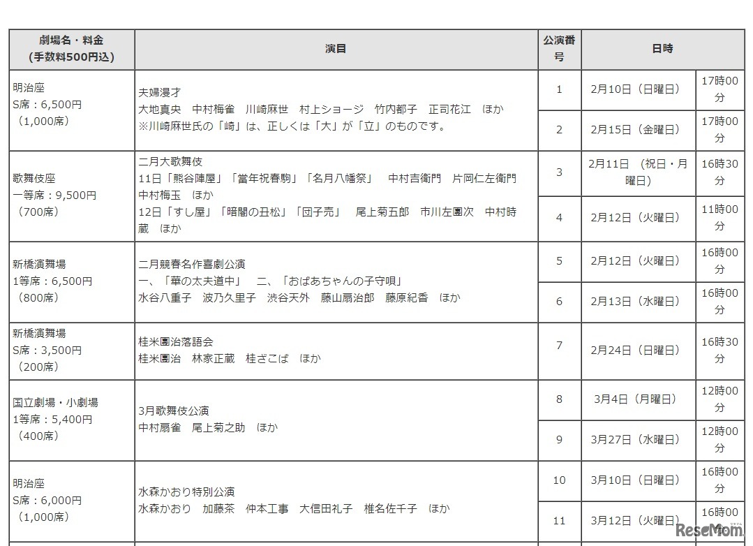 東京都と東京都歴史文化財団、日本演劇興行協会、都民劇場は、冬の「都民半額観劇会」(第160回)を開催する。対象の公演を入場券1枚につき、各劇場が指定する代金の半額に、取扱手数料500円を加えた額で観劇できる。