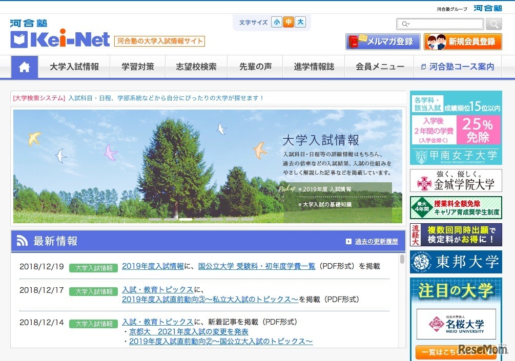河合塾の大学入試情報サイト「Kei-Net」は2018年12月19日、2019年度入試情報に「国公立大学 受験料・初年度学費一覧」を掲載した。各大学・学部の受験料、入学金、授業料(1年分)などをまとめている。