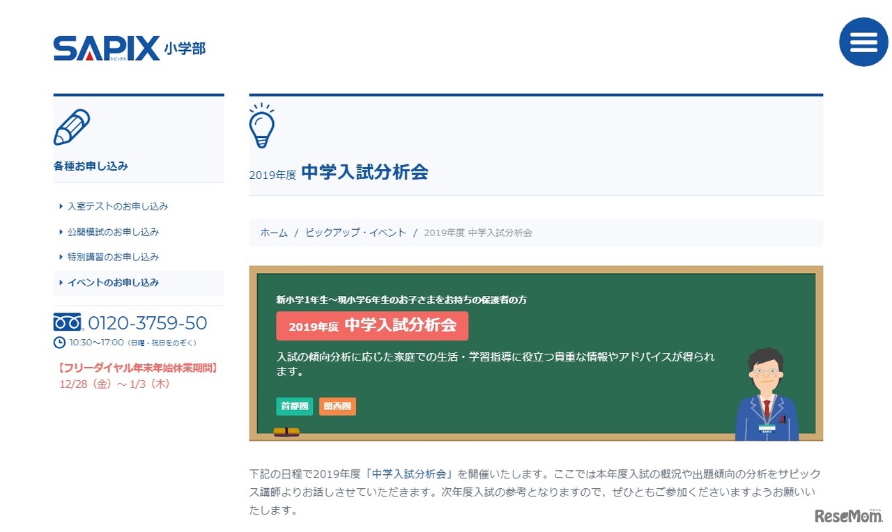 SAPIX小学部は2019年2月から3月にかけて、首都圏および関西圏にて「2019年度中学入試分析会」を開催する。申込期間は、2019年1月24日午後2時から各開催日当日の開演時間まで。ただし、各会場とも定員になり次第、受付を終了する。入場無料。