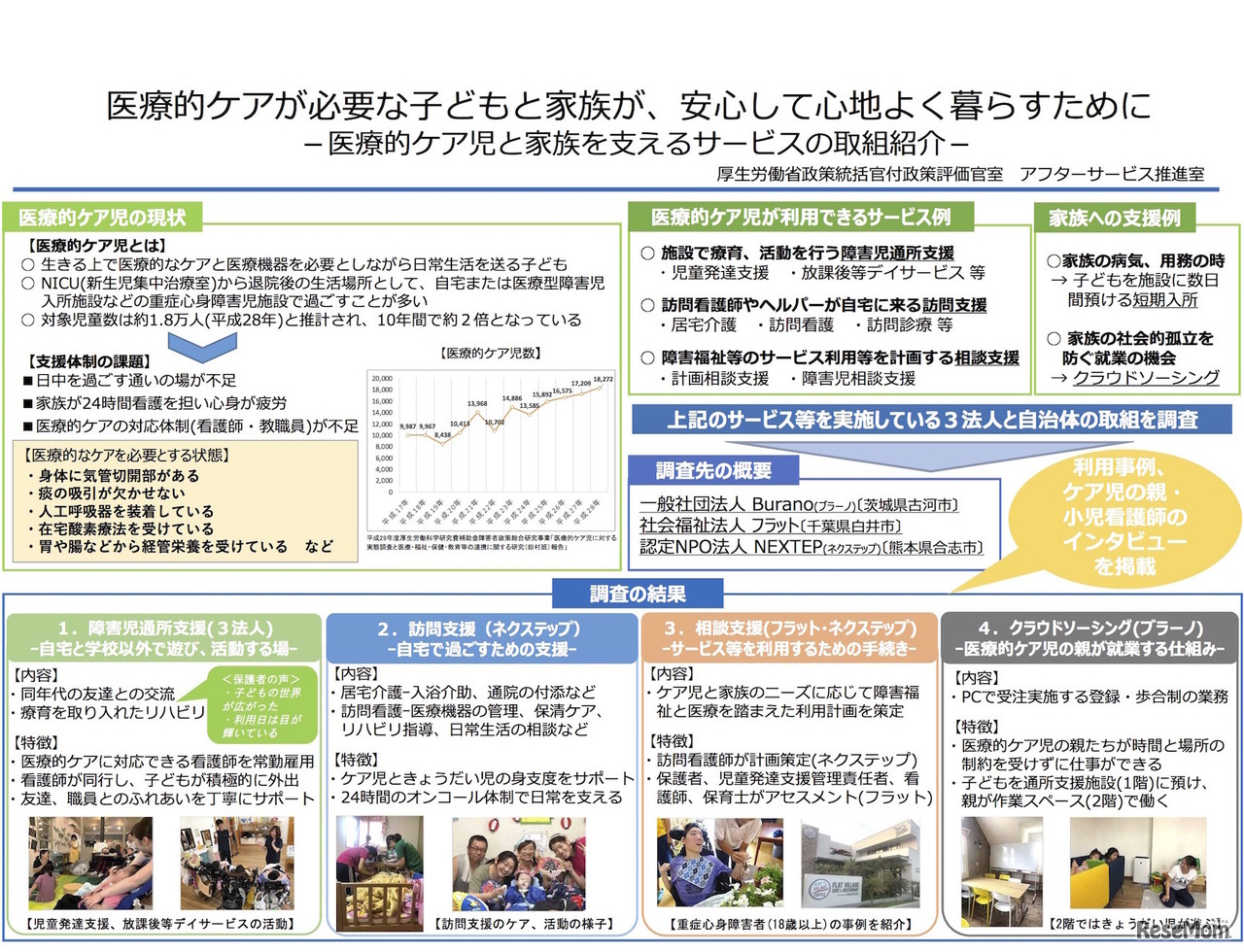 厚生労働省は2018年12月19日、医療的ケアが必要な子どもと家族を支える取組みについて、報告書を公表した。障害福祉サービスなどを実施する3法人の事例などを紹介。クラウドソーシングを活用して、社会的に孤立しがちな医療的ケア児の親が働く場を提供する団体もあった。