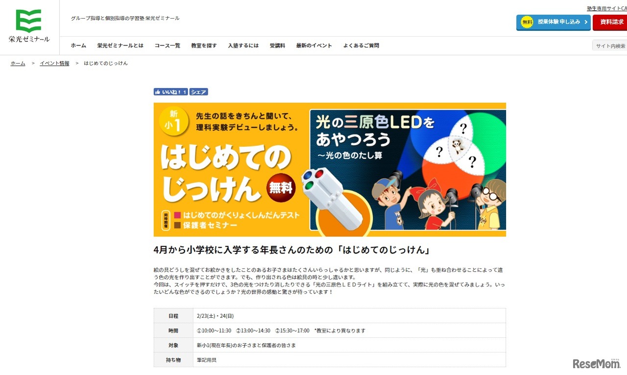 栄光ゼミナールは2019年2月23日と24日、新小1生(現在年長)の子どもと保護者を対象に「はじめてのじっけん」を開催する。参加無料。申込みは、Webサイトにて受け付けている。同日に、「はじめてのがくりょくしんだんテスト」と「保護者セミナー」も開催する。