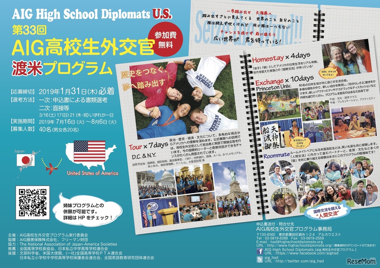 AIGジャパンは、参加費無料の国際交流プログラム「AIG高校生外交官プログラム」の2019年度参加者募集を開始した。米国へ派遣する「渡米プログラム」と、日本へ招聘された米国高校生を迎え入れる「日本プログラム」合わせて60人を募集。応募締切は2019年1月31日。