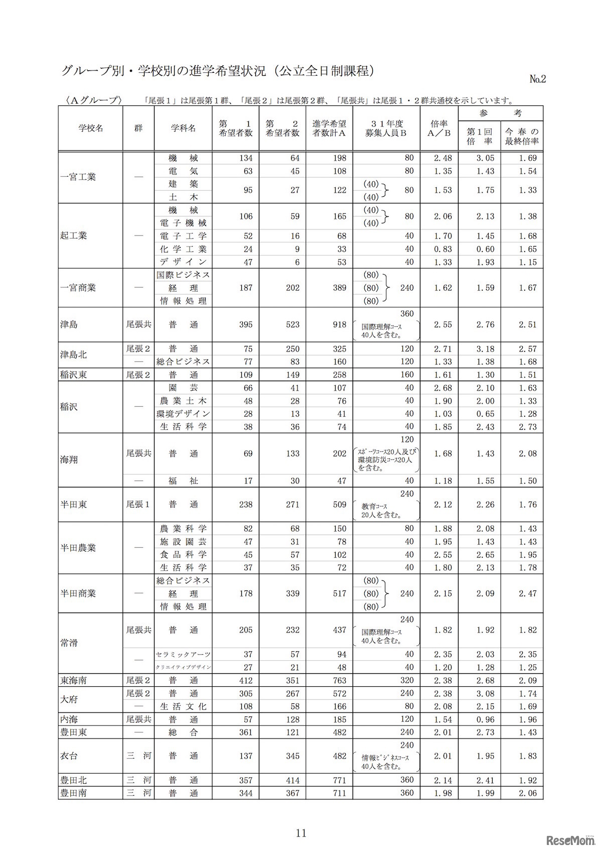 画像出典:愛知県教育委員会「中学校卒業見込者の進路希望状況調査」平成30年度第2回 グループ別・学校別の進学希望状況(公立全日制課程)
