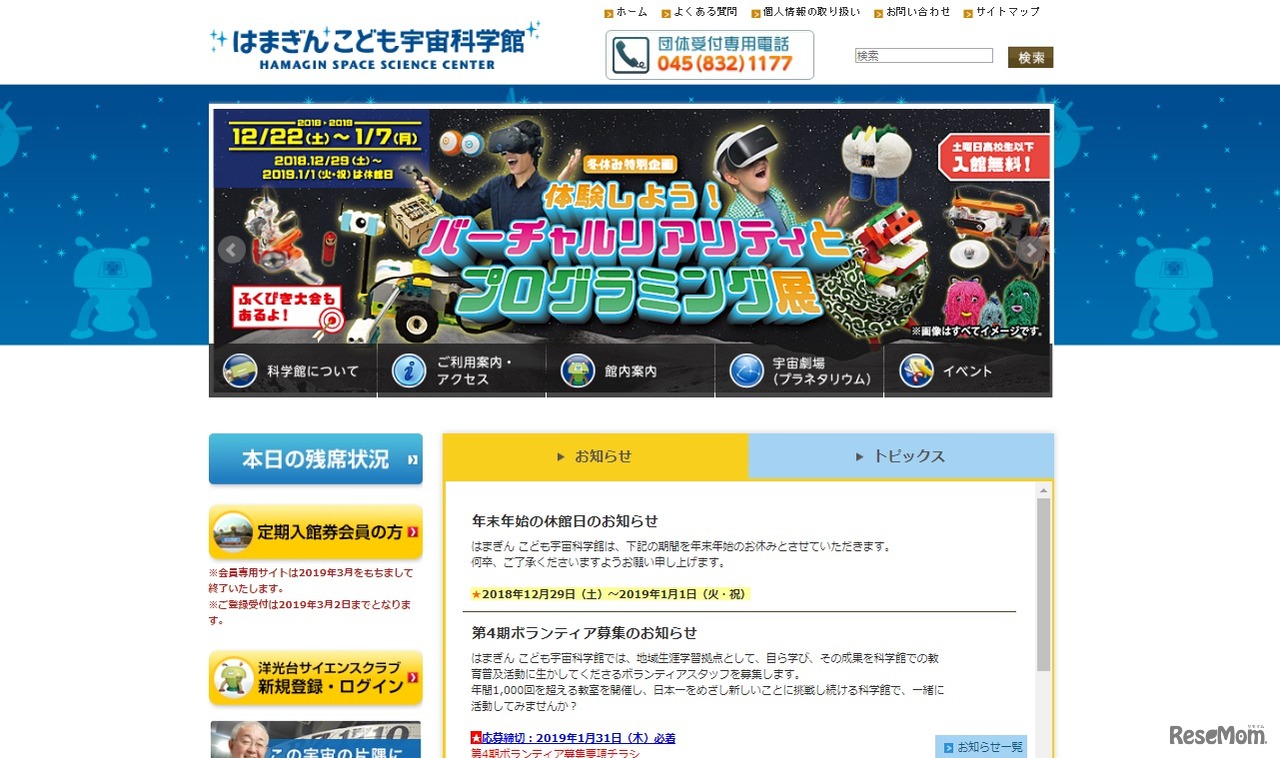はまぎん こども宇宙科学館は2018年12月22日から2019年1月7日まで、企画展「体験しよう!バーチャルリアリティとプログラミング展」を開催する。バーチャルリアリティ(VR)で月面重力や宇宙空間を体験できるほか、プログラミング教室も実施する。
