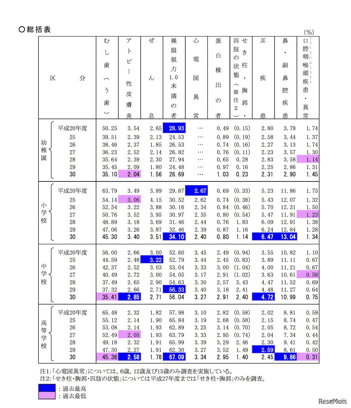 文部科学省は2018年12月21日、平成30年度(2018年度)学校保健統計調査(速報)の結果概要を公表した。むし歯の割合はピーク時より減少が続き、中学校と高校では過去最低を記録。裸眼視力1.0未満の者は小学校と高校で過去最高の割合となった。