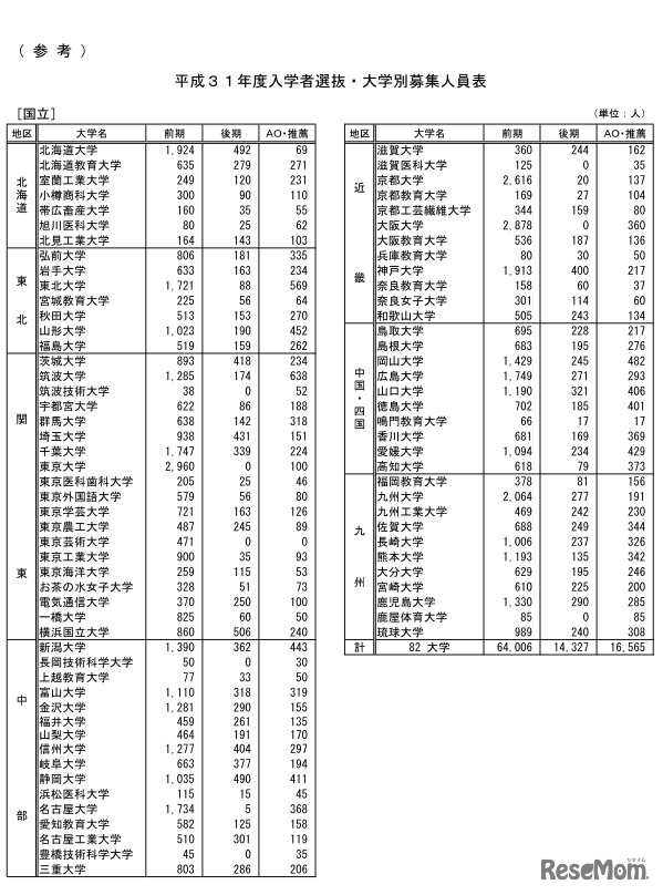 文部科学省は2018年12月20日、2019年度国公立大学入学者選抜の概要を発表した。国立82大学と公立90大学で計12万6,690人募集する。東京外国語大学(国際日本)や横浜市立大学(国際教養、国際商、理)などで新たに推薦入試を行う。