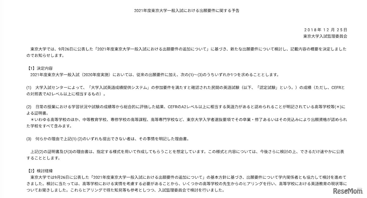 東京大学は2018年12月25日、2021年度の一般入試における出願要件に関する予告を掲載。新たな出願要件のひとつ、CEFRのA2レベル以上の英語力を認める証明書では、調査書への記載ではなく「英語力についての証明書」を別紙で求める。