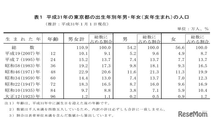 画像出典:東京都 2019年の東京都の出生年別年男・年女(亥年生まれ)の人口