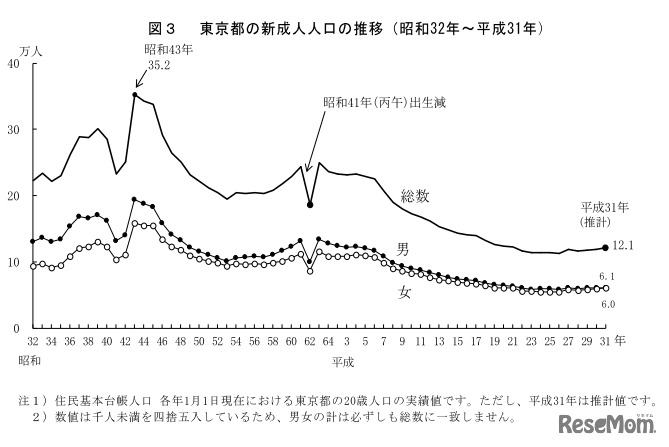 東京都は2018年12月25日、「年男・年女人口」と「新成人人口」の人口推計を発表した。2019年1日1日現在、東京都の年男は54万2千人、年女は56万6千人、新成人人口は12万1千人にのぼる。新成人人口は前年と比べて2千人増加している。