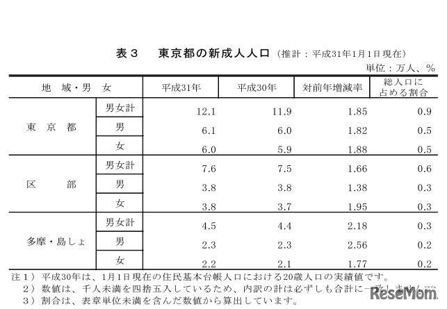 東京都は2018年12月25日、「年男・年女人口」と「新成人人口」の人口推計を発表した。2019年1日1日現在、東京都の年男は54万2千人、年女は56万6千人、新成人人口は12万1千人にのぼる。新成人人口は前年と比べて2千人増加している。