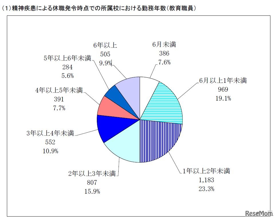 文部科学省は平成30年12月25日、平成29年度公立学校教職員の人事行政状況調査の結果を公表した。精神疾患による病気休職者数は5,077人で、前年度(平成28年度)から186人増加した。所属校の勤務年数別では、3年未満が7割近くを占めた。