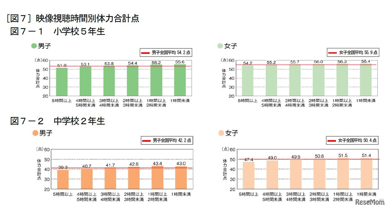 画像出典:スポーツ庁「平成30年度全国体力・運動能力、運動習慣等調査」 映像視聴時間別体力合計点