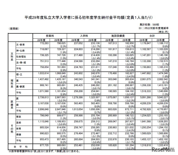 H29年度私立大学の初年度納付金、平均133万3,418円 2枚目の写真・画像