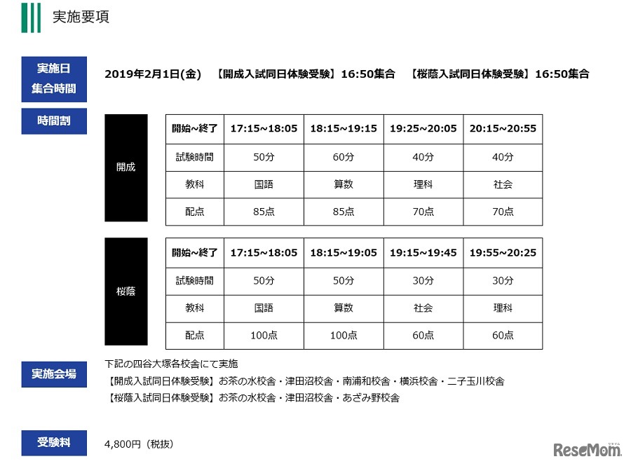 四谷大塚は2019年2月1日夕方より、小学5年生を対象に2019年度の開成・桜蔭の入試問題にチャレンジできる「開成入試同日体験受験」と「桜蔭入試同日体験受験」を実施する。受験料は4,800円(税別)。校舎窓口もしくはWebサイトより申込みを受け付けている。