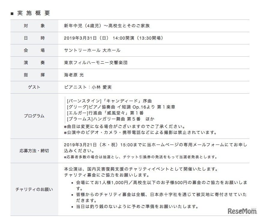 TOMASや伸芽会などを運営するリソー教育グループは2019年3月31日、第20回「トーマス・コンサート」を開催する。演奏は東京フィルハーモニー交響楽団。新年中児(4歳児)から高校生とその家族を対象に、抽選で2,000人を招待する。申込みは2019年3月21日まで。