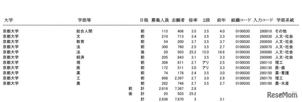 画像出典:文部科学省 京都大学の志願状況(平成31年2月6日10時現在)