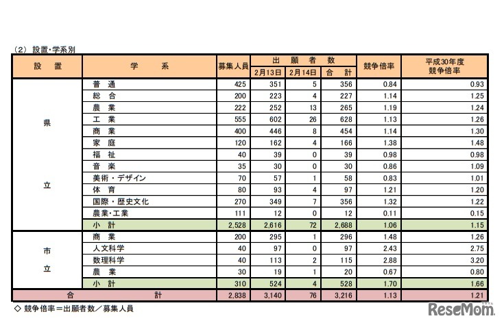 平成31年度奈良県公立高等学校入学者特色選抜出願状況<設置・学系別>
