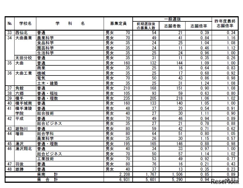 秋田県教育委員会は2019年2月15日、平成31年度(2019年度)秋田県公立高等学校入学者選抜の一般選抜志願者数(志願先変更前)を発表した。一般選抜における全日制課程の募集人数5,601人に対して5,290人が志願し、志願倍率は0.94倍となった。