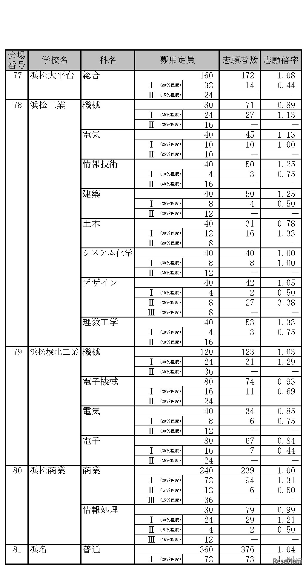 静岡県教育委員会は2019年2月20日、平成31年度(2019年度)静岡県公立高等学校入学者選抜の一般選抜に係る、志願変更受付前の志願状況および倍率を公開した。