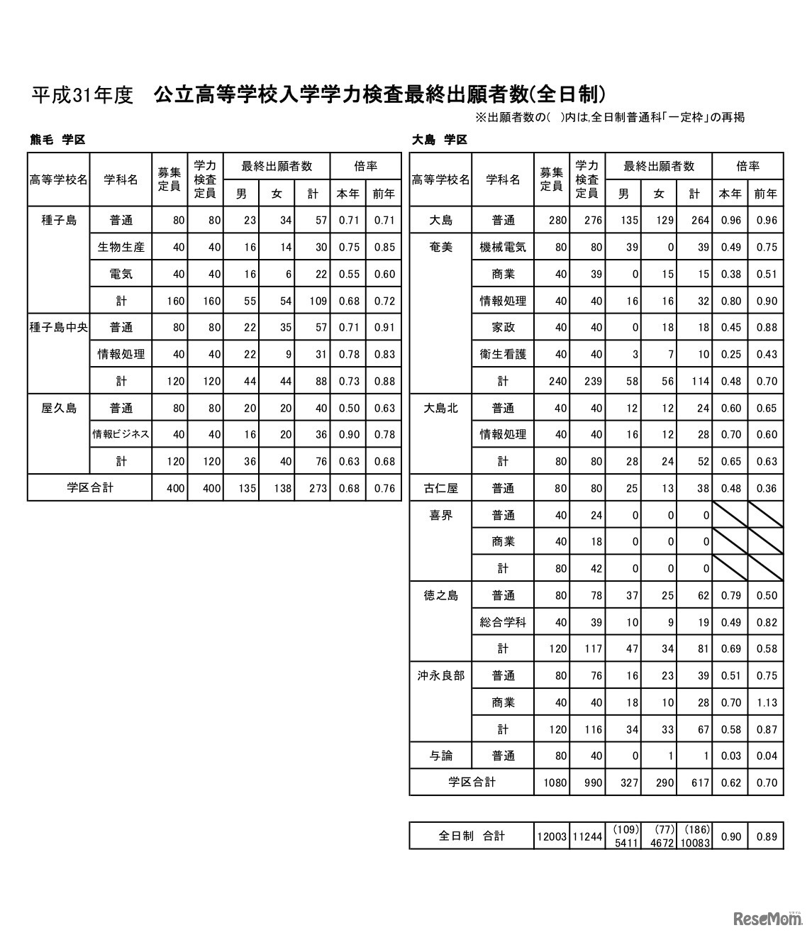 画像出典:鹿児島県教育委員会 2019年2月25日掲載「平成31年度公立高等学校入学者選抜学力検査最終出願者数」 公立高等学校入学学力検査最終出願者数(全日制)